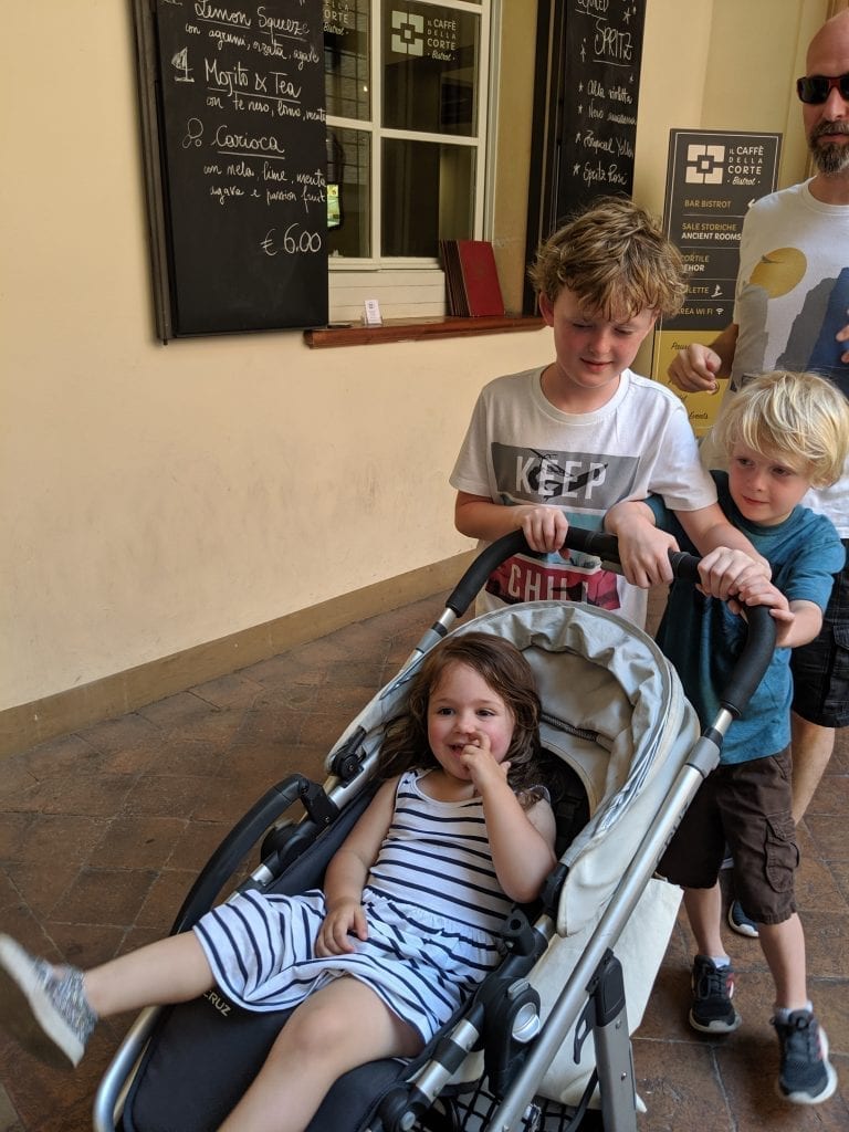 Our friend Keryn stopped in Bologna for lunch with her family. Marcella had her boys wrapped around her finger.